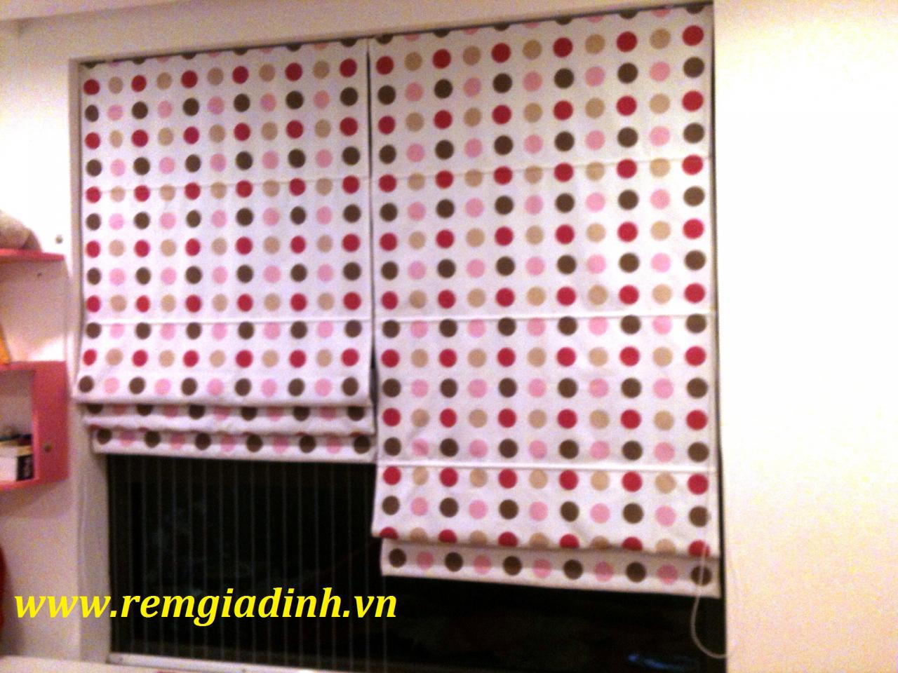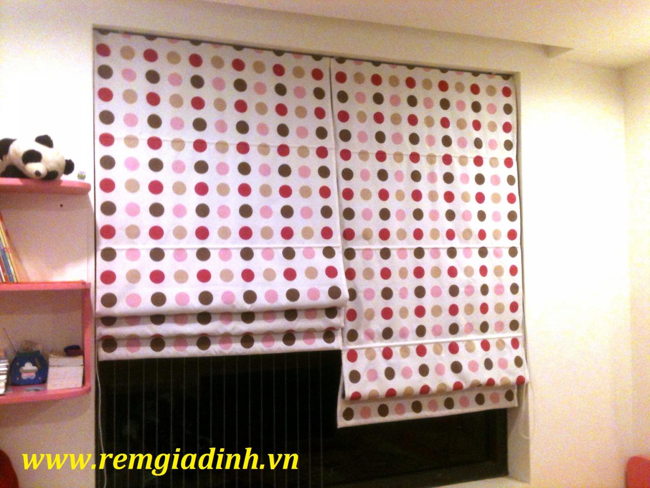 Rèm cửa xếp lớp họa tiết chấm bi tông màu hồng.